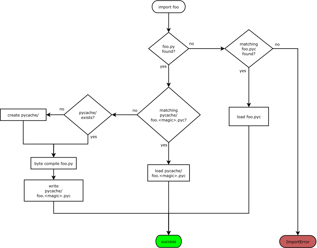 When Python searches for a module to import (say foo), it may find one of several situations. As per current Python rules, the term “matching pyc” means that the magic number matches the current interpreter’s magic number, and the source file’s timestamp matches the timestamp in the pyc file exactly.